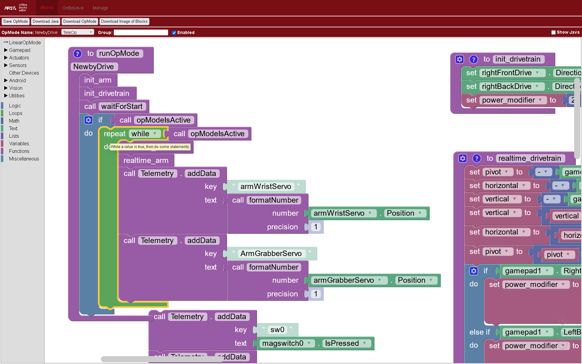 Our robot is programmed using Blockly (which is very similar to Scratch) and Java. Unlike Scratch, Blockly allows us to combine robot sensors and game controllers to design controls for the robot motors.