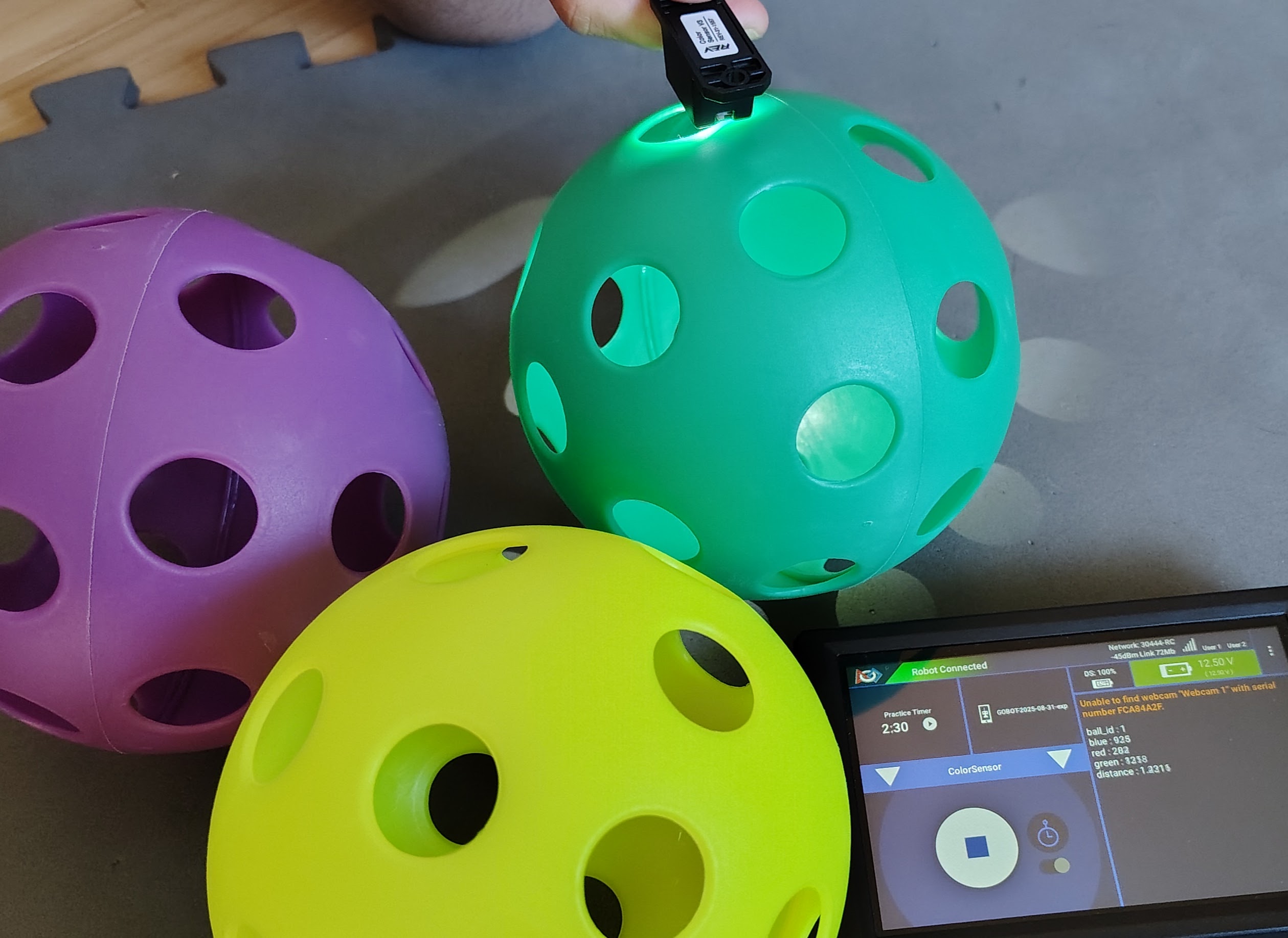 As part of our robot, we really want to include a ball sorter. That should allow a quick intake to pull in balls and then choose specific artifact colors for scoring patterns even in auto! A critical element is having a mechanism to actually identify the color. We wanted to use a Rev color sensor to identify the balls.