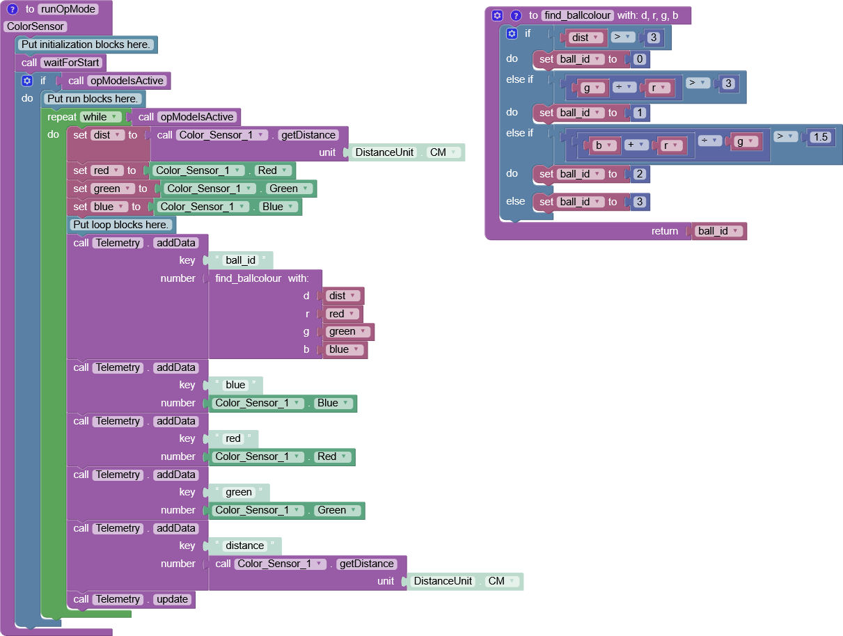 We created a Blocks program to identify the color of an artifact using a RevRobotics v3 ColorSensor. We found rules to use the measured distance, red, green, and blue values from the sensor that separate the different balls.